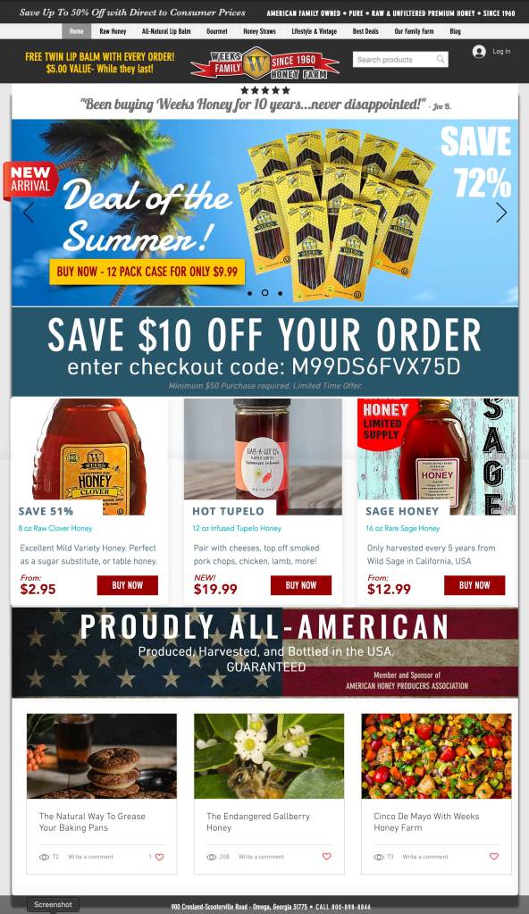Weeks Honey Farm’s Retail Website changes quite often to accommodate new product launches and promotions. The Honey business is a very competitive one, but this All-American Family Farm has been in business since 1960 by providing unapologetic quality where others often sell a lesser product. By going Direct to Consumer they are redefining the market in an unstable economy.